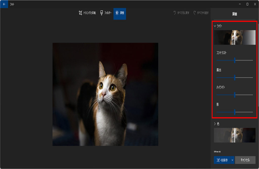※下記にアプリ、フォトで画像の明るさと色調を編集の設定記事もあります。