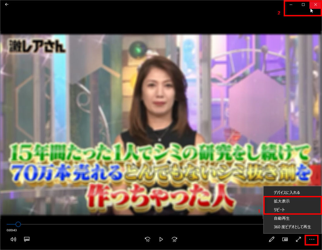 1 右下の3点ボタンをクリック、拡大表示、リピート再生などの設定も可能です、