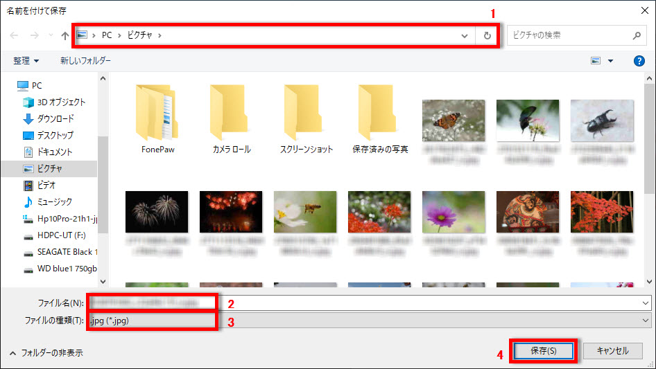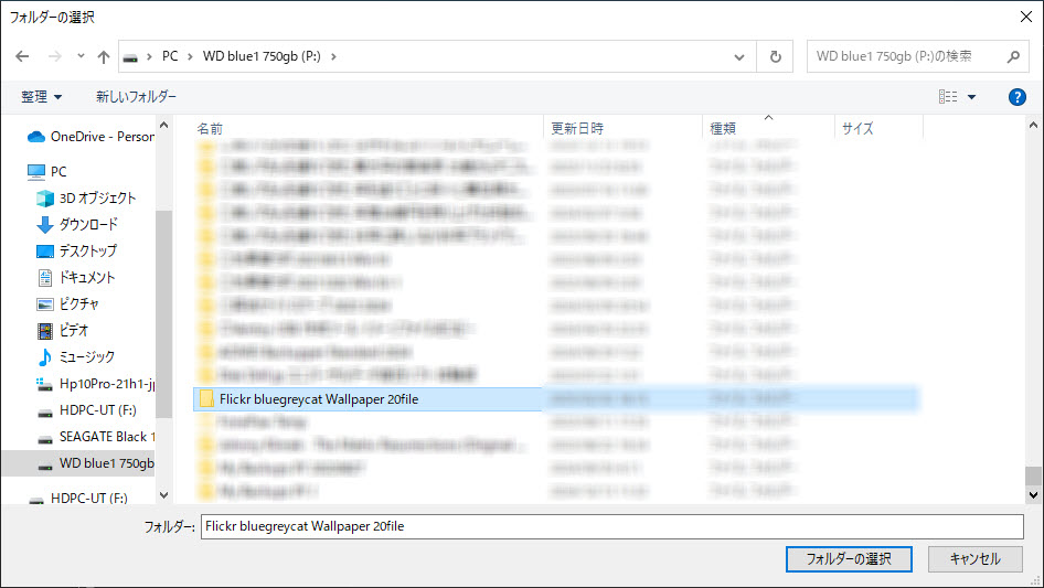 例として、外付けハードディスク「P:」ドライブのフォルダーを指定します、