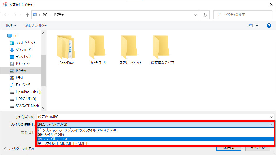 ここでは例として、保存先をピクチャフォルダーに、ファイル名は「設定画面」に、