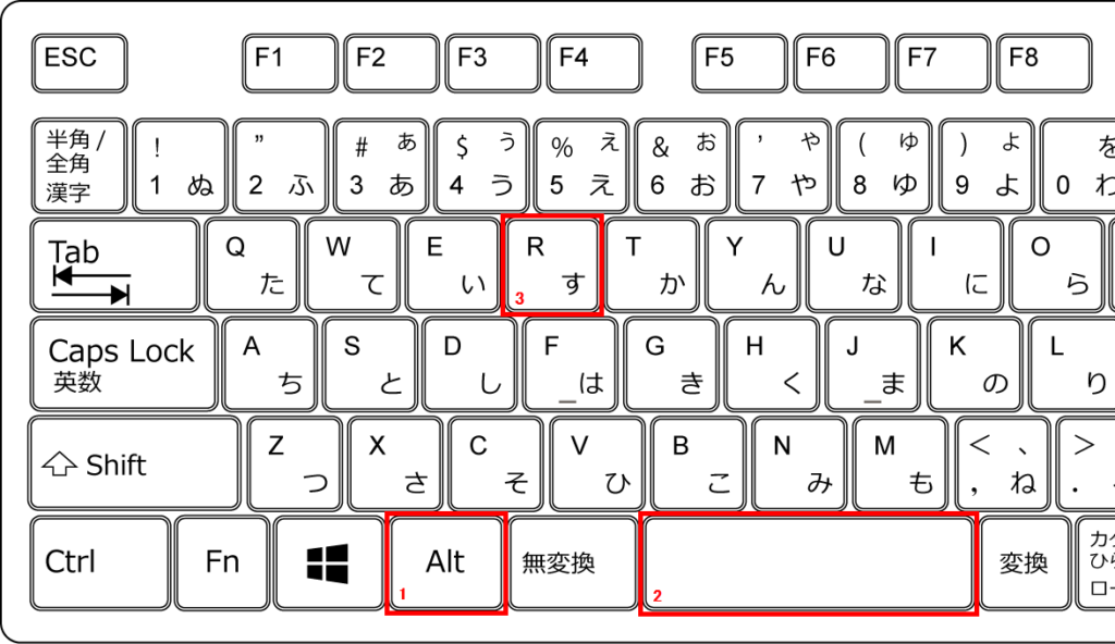 キーボードの操作で、1 「Alt」キーと、2 「スペース」キーを押しながら