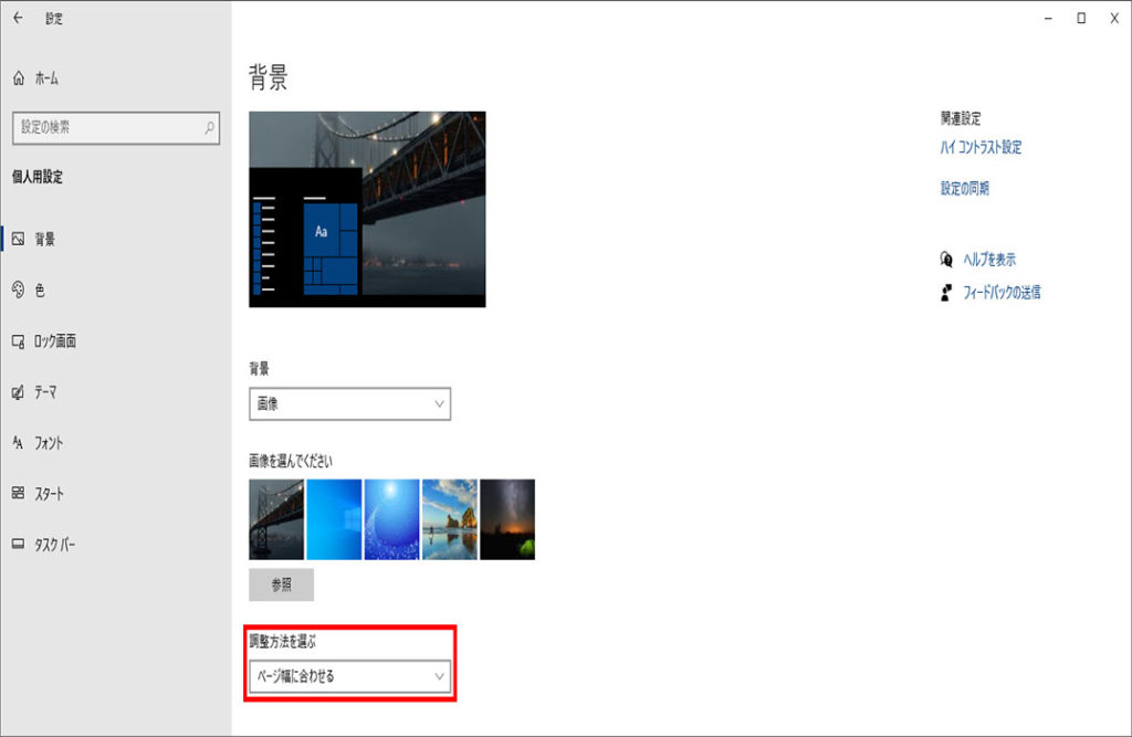 背景が表示されます、右メニューの調整方法を選ぶの▽をクリック、画像の配置を