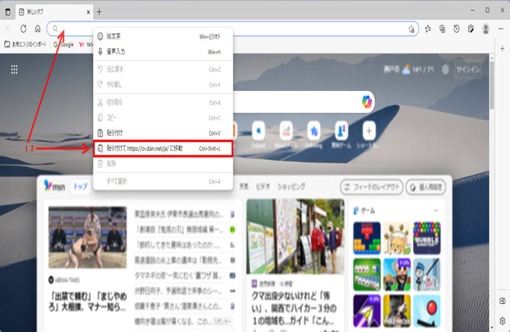 1 「Microsoft Edge」のアドレスバーを右クリック、