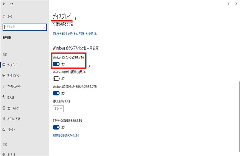 「ディスプレイ」画面の「Windowsにアニメーションを表示する」の「オン」、