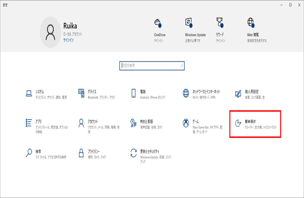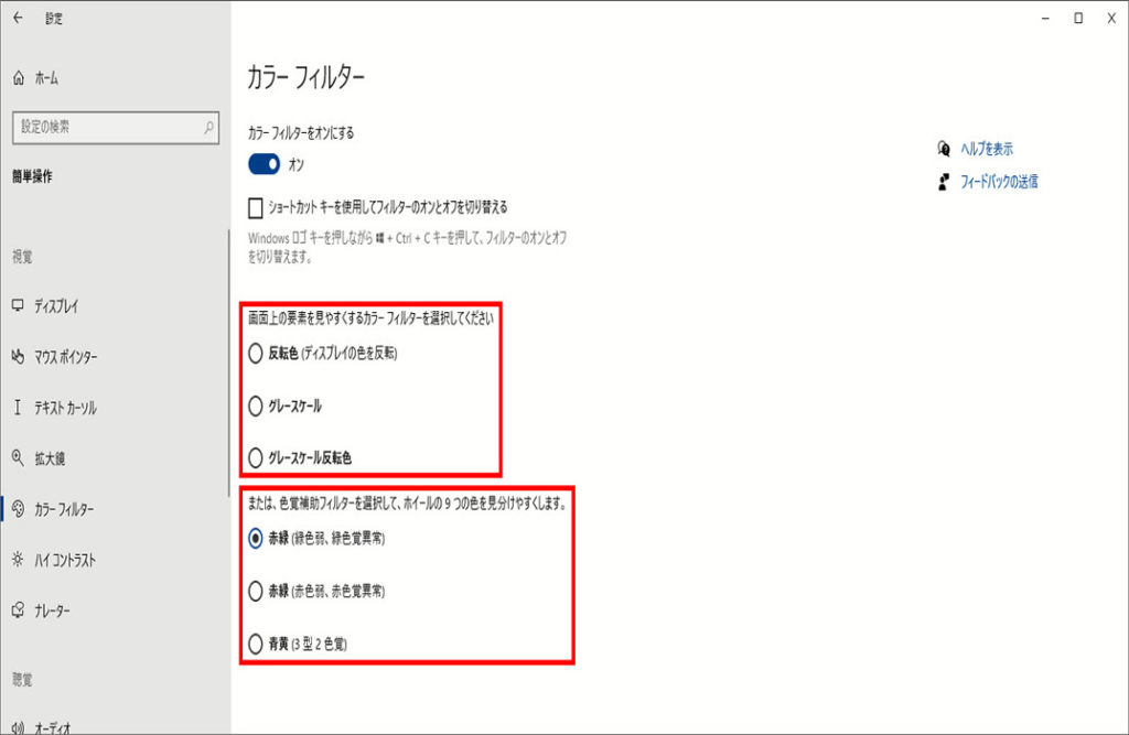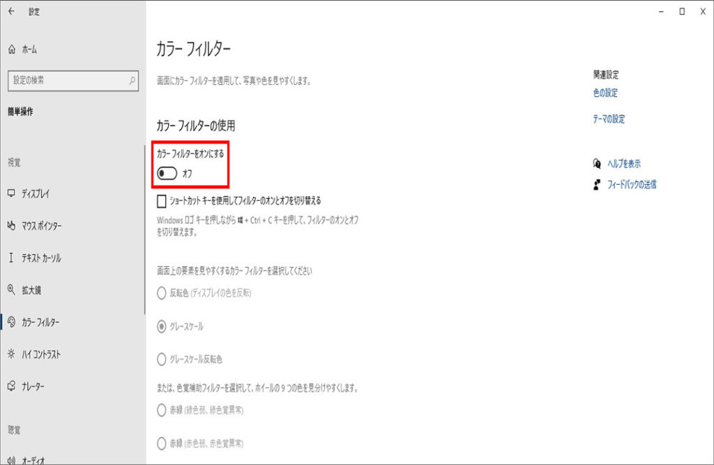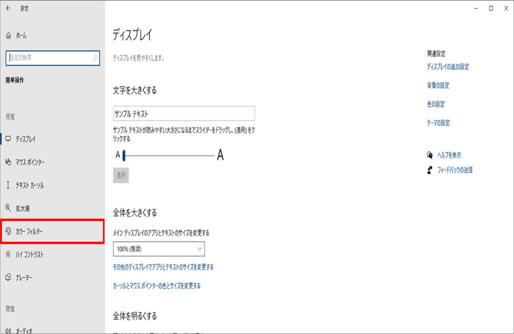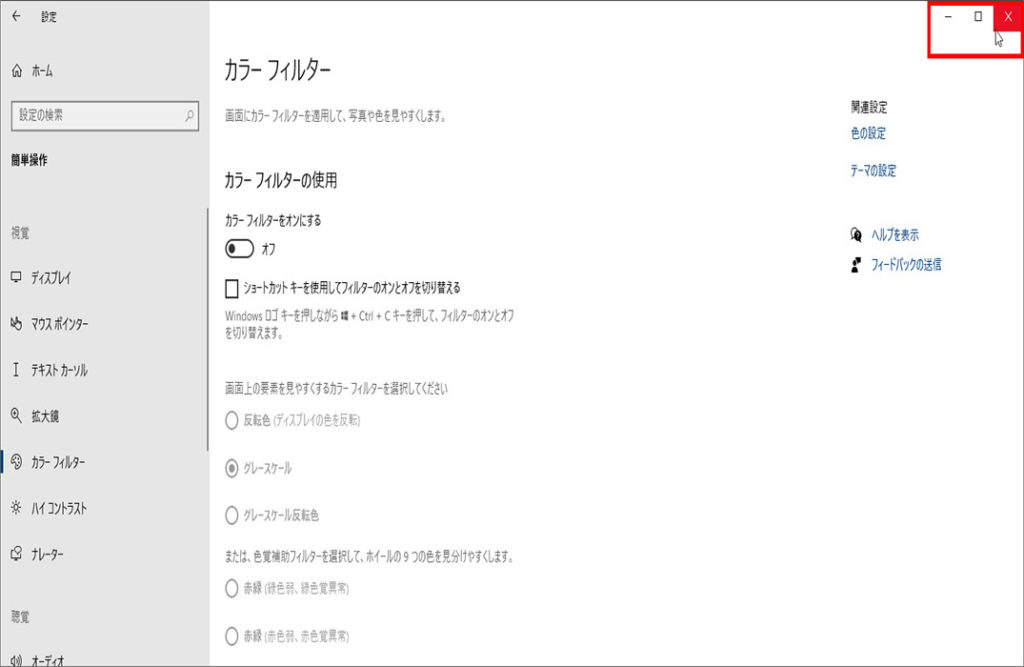 Windows10の画面全体の色調を変更するにはカラーフィルターから行います、