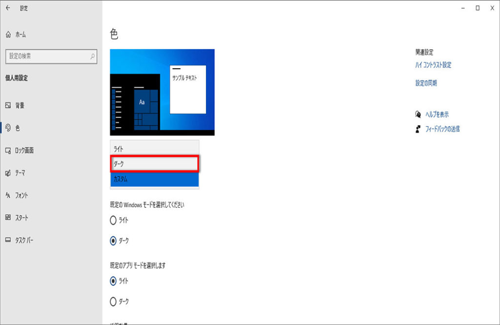 「色を選択する」欄のボックスからダークモードに設定できます。