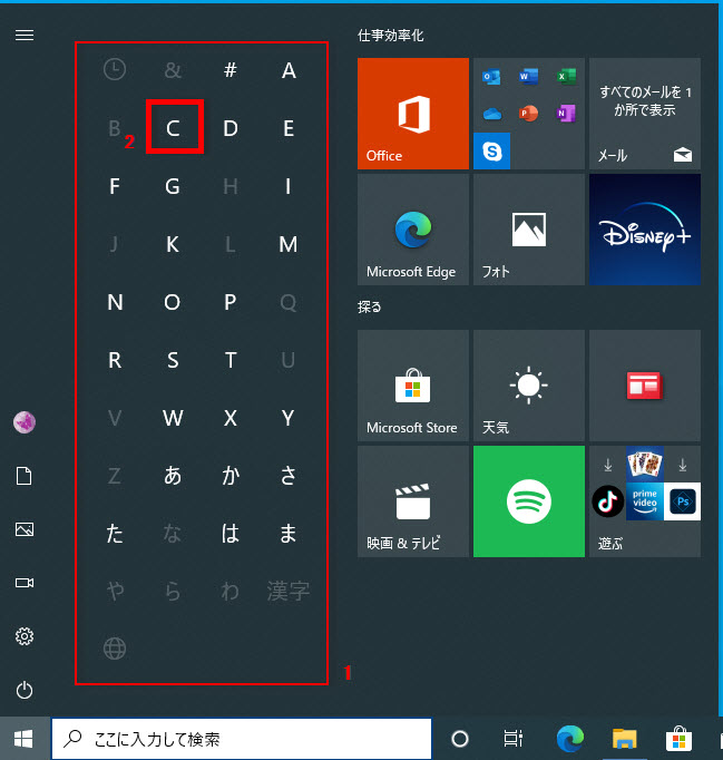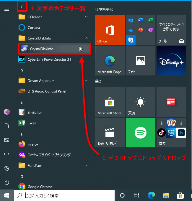 ここでは、例として「CrystalDiskInfo」を探します、「C」をクリックします。