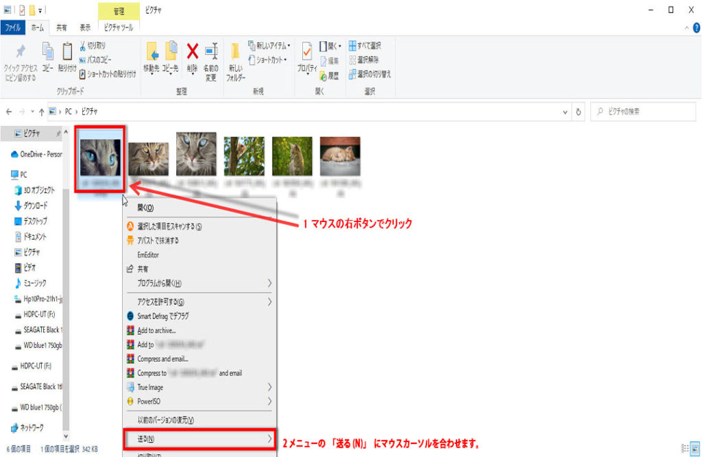 2 メニューの「送る(N)」にマウスカーソルを合わせます。