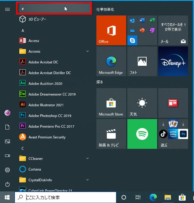 すべてのアプリの一覧のカテゴリ「#」をクリックします、