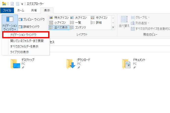 ナビゲーションウィンドウの有効または無効を確認しましょう。