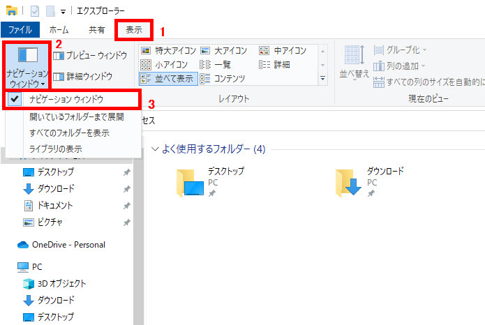 クイックアクセスが表示されます、画面上部の、1 「表示タブ」をクリックします