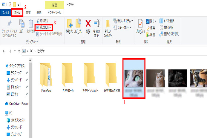 2 マウスで右クリック、3 表示一覧から「パスのコピー」をクリックします。