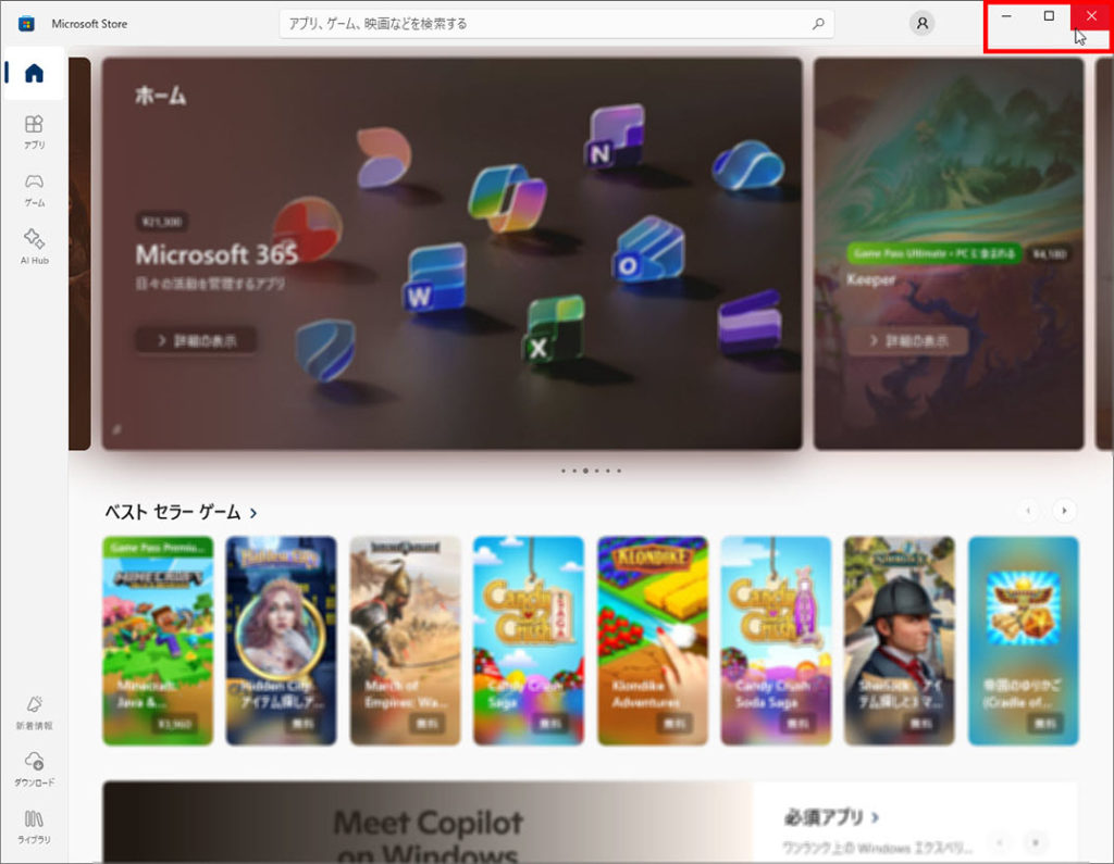「Microsoft Store」画面の右上の「×」をクリックして閉じます、操作は以上です、