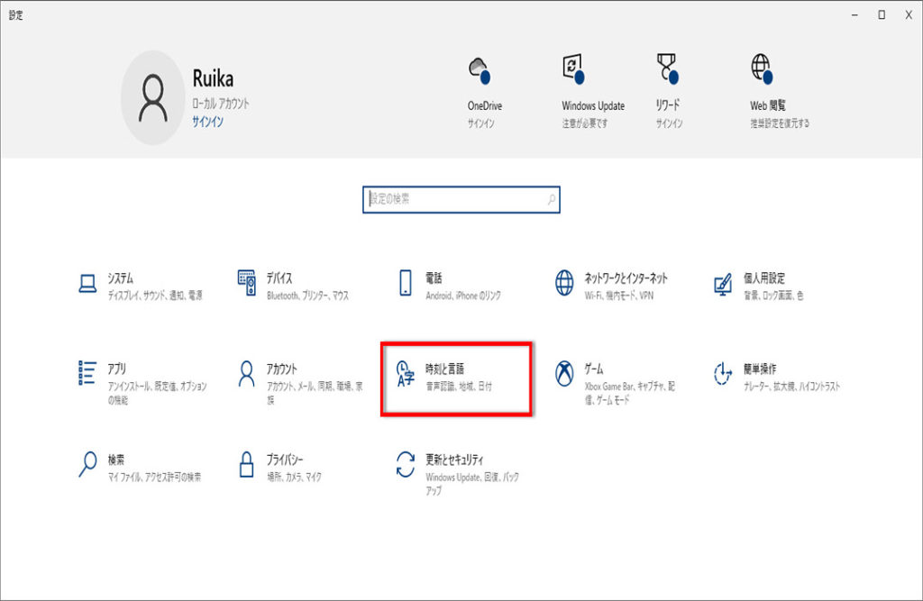 「設定」画面が表示されます「時刻と言語」をクリックします。