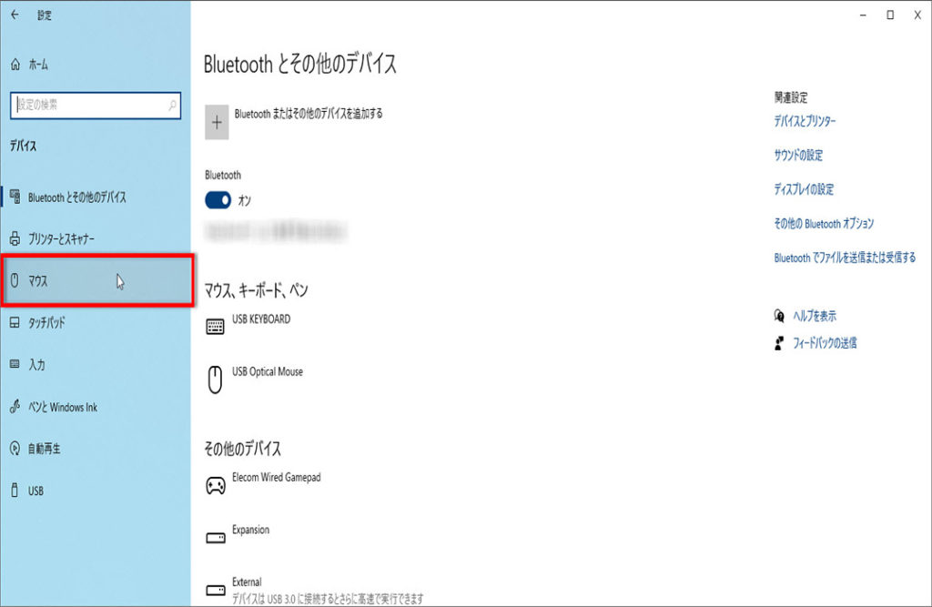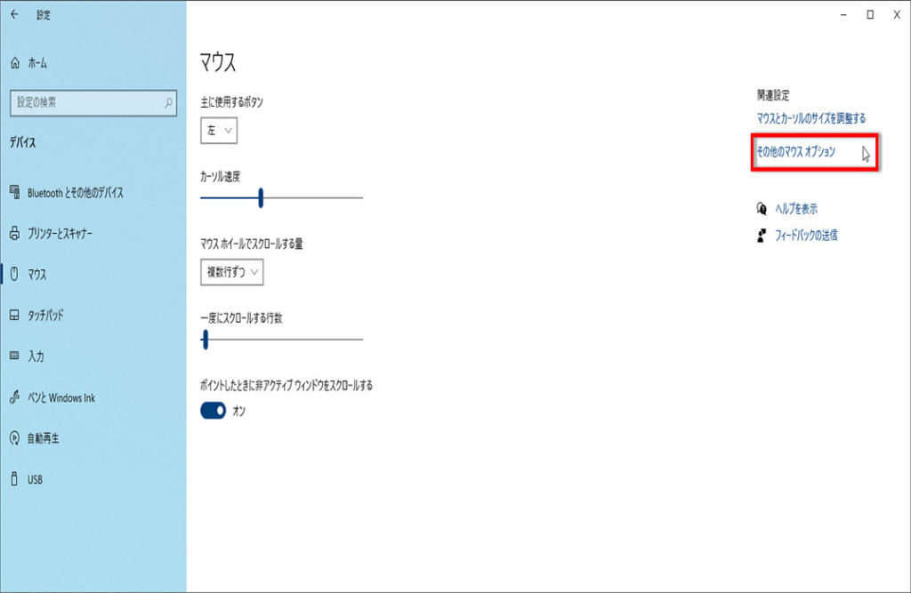 「マウス」画面が表示されます、「関連設定」の「その他のマウスオプション」を