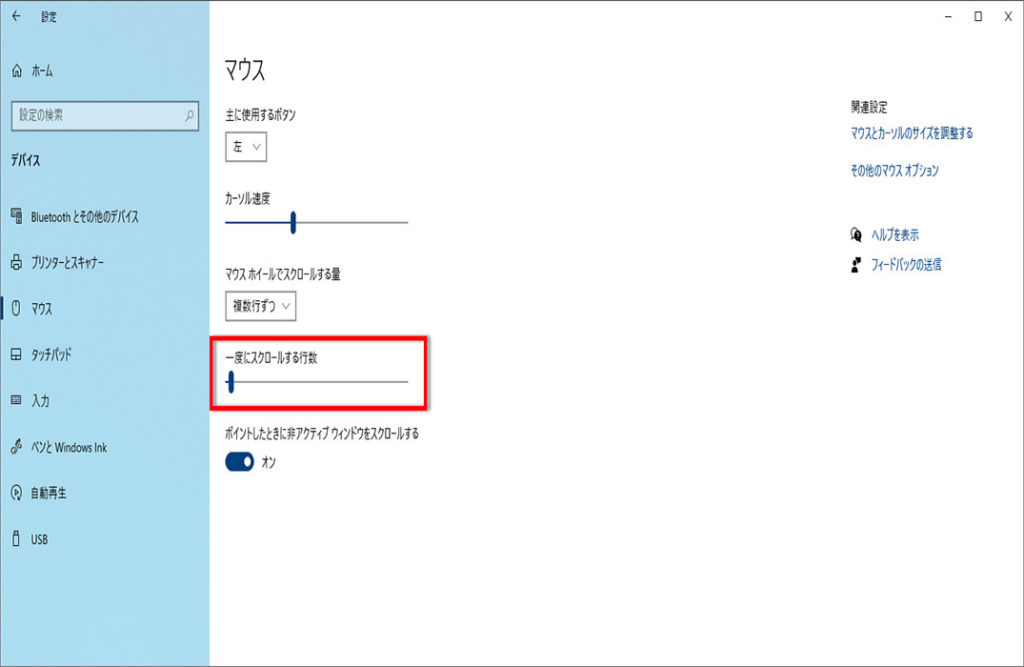 「一度にスクロールする行数」でスライダーを左右にドラッグ、お気に入りの行数を、
