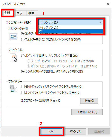 1 「フォルダーオプション」画面が表示されます、「全般タブ」の