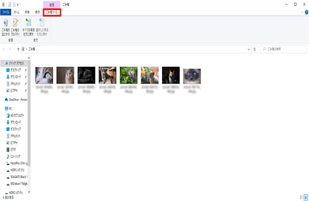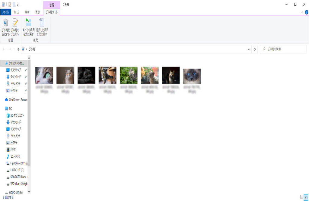 「ごみ箱」フォルダーが表示されます、例として画像を8ファイル入れています。