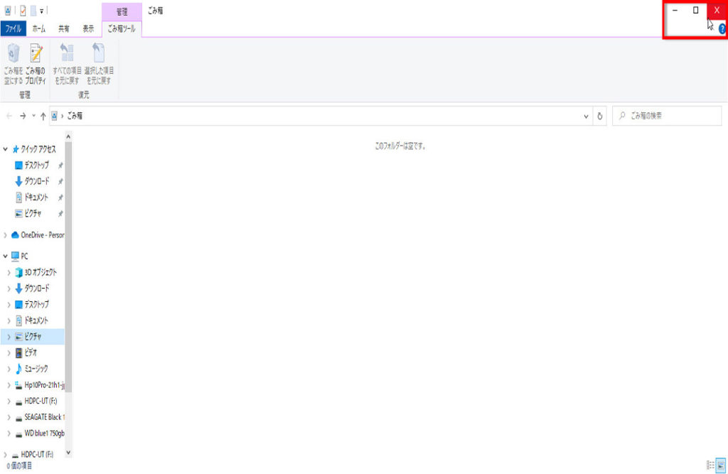 「ごみ箱」フォルダーの右上の「×」をクリックして閉じます、操作は以上です、