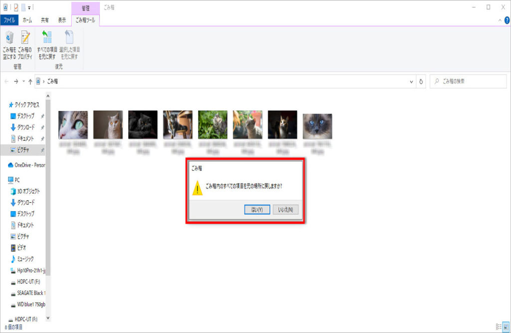 「ごみ箱内のすべての項目を元の場所に戻しますか?」画面が表示されます、