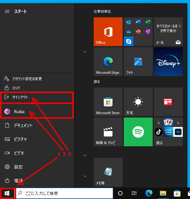 Windows10のサインアウトは、パソコンマウス、キーボードなどから行います。
