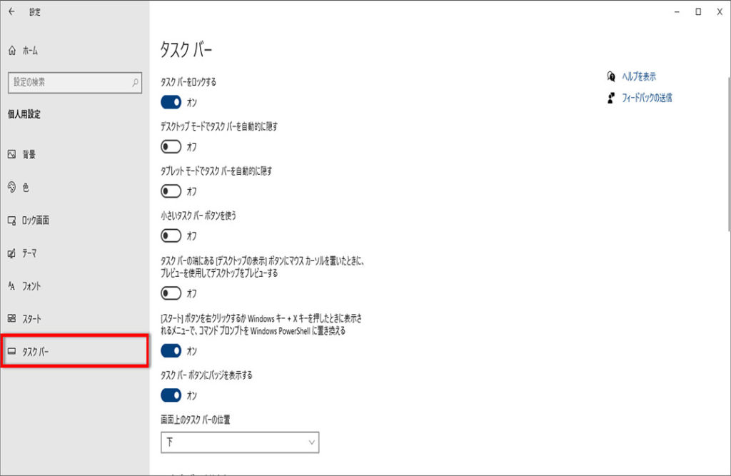 「個人用設定」が表示されます、左メニューから「タスクバー」をクリック、