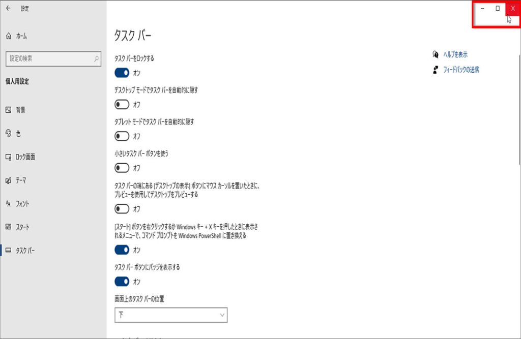「タスクバー」画面の右上の「×」をクリックして閉じます、操作は以上です、