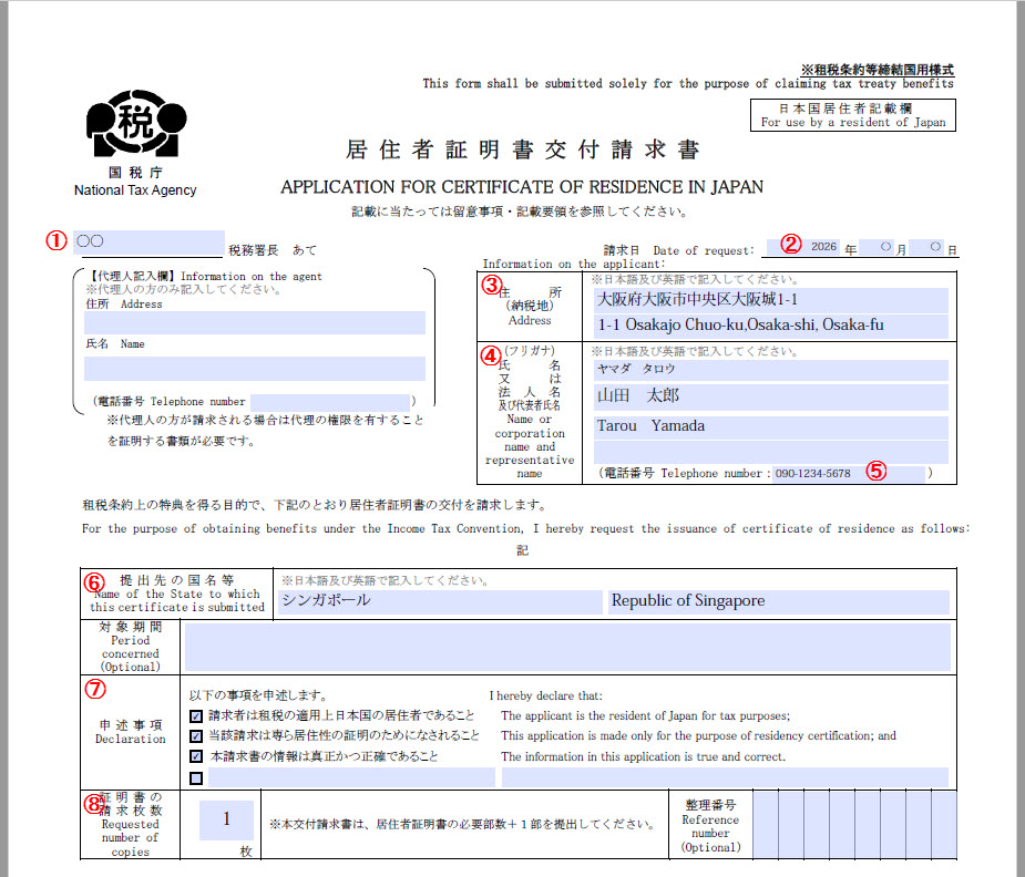 ダウンロードしたpdfファイル「居住者証明書交付請求書」の①から⑧を入力します。