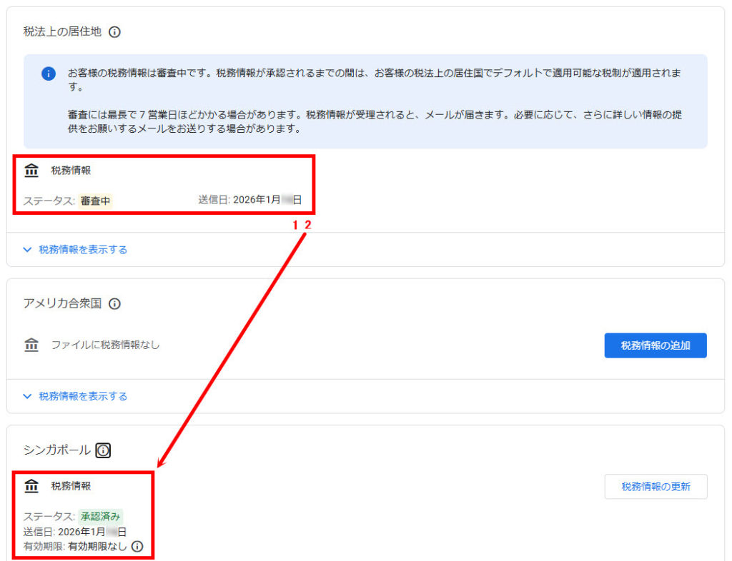 ここでは「アドセンス」の居住者証明書の記入から承認まで(シンガポールの税務情報