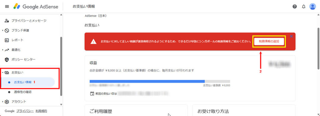 1 「お支払い情報」、2 「税務情報の追加」をクリックします。