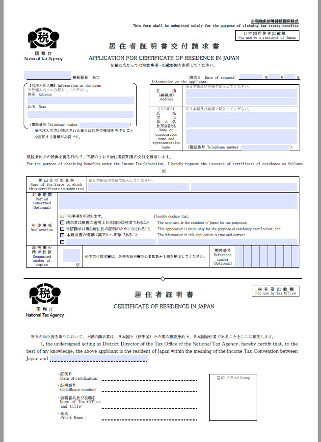 国税庁様式→(居住者証明書交付請求書と居住者証明書が一体となっています)