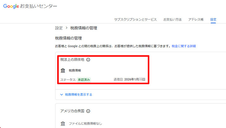 グーグルアドセンスから「税法上の居住地」における税務情報が受理されましたという