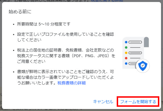 グーグルアドセンスで収益がある場合は「税務情報の追加」を申請します、日本に在住の