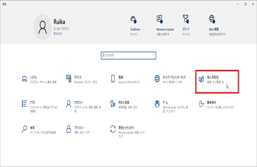 「設定」画面が表示されます「個人用設定」をクリックします。