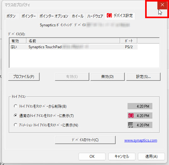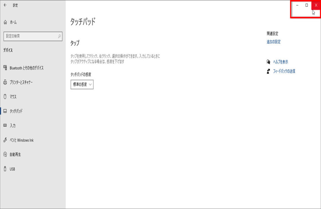 「タッチパッド」画面の右上の「×」もクリックして閉じます、操作は以上です。