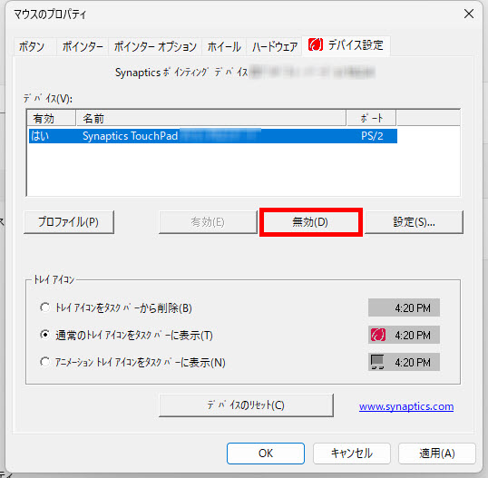 「無効(D)ボタン」をクリックします、タッチパッドは動作しません。