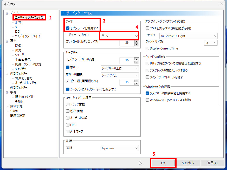 3 テーマのモダンテーマを使用するにチェックを入れて、