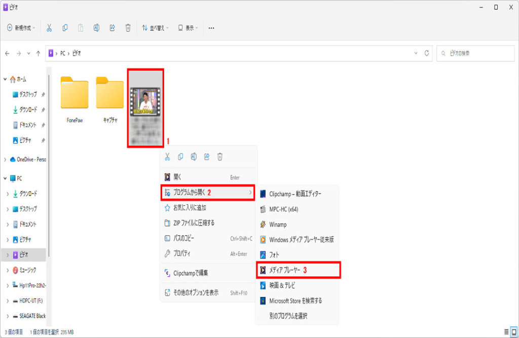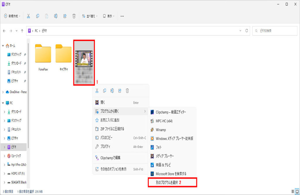 動画ファイルを右クリック→別のプログラムを選択をクリック→下までスクロール