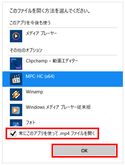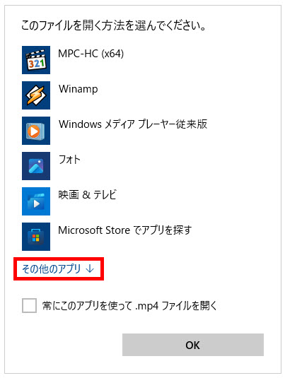 ※下記にアプリを指定して動画ファイルなどを開く方法の設定記事もあります。