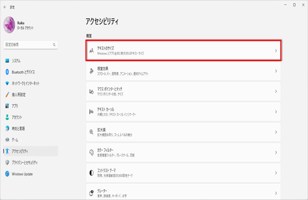 「アクセシビリティ」画面が表示されます「視覚」の「テキストのサイズ」を