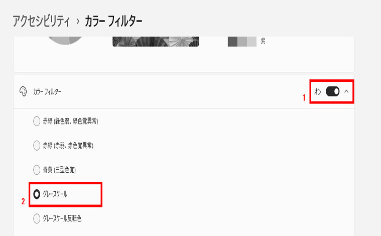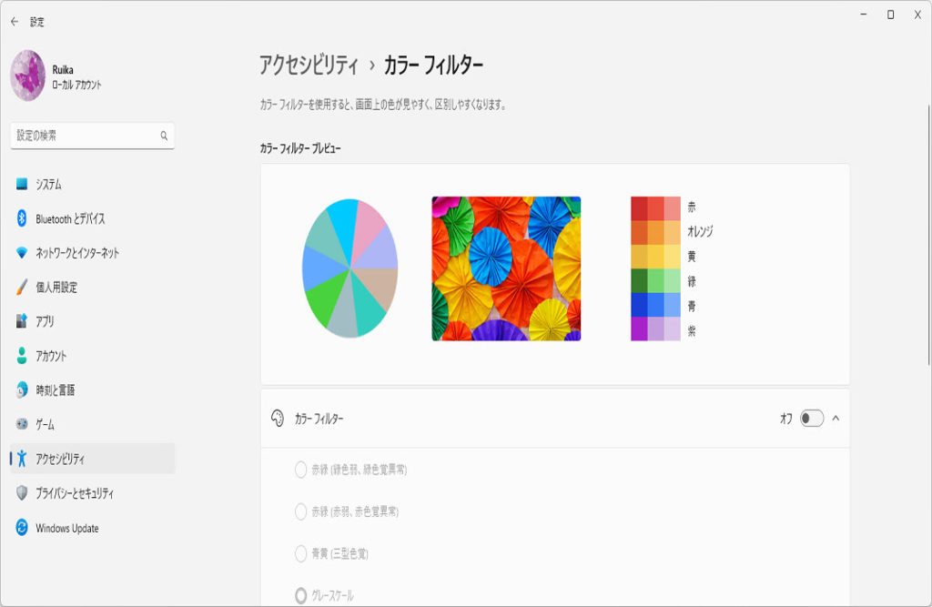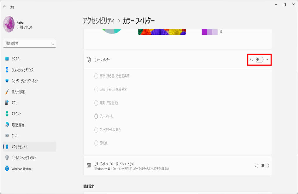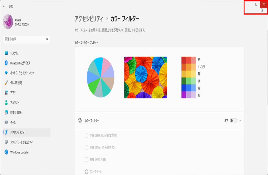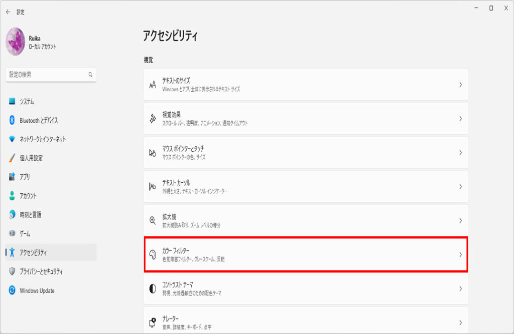 Windows11の画面全体の色調を変更するにはカラーフィルターから行います、