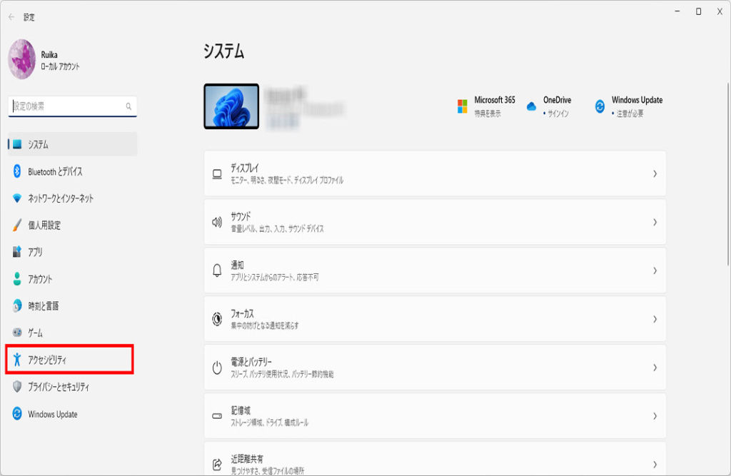 「設定」が表示されます、左メニューの「アクセシビリティ」をクリックします。