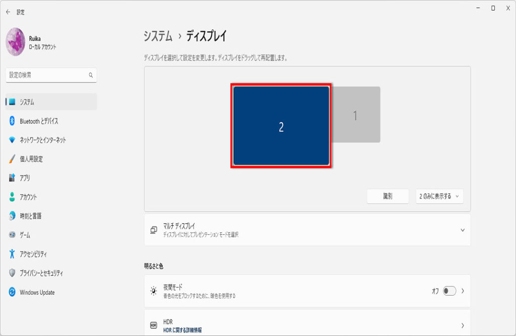 「ディスプレイ」が表示されます、ノートPCで外付けモニターに接続している場合は