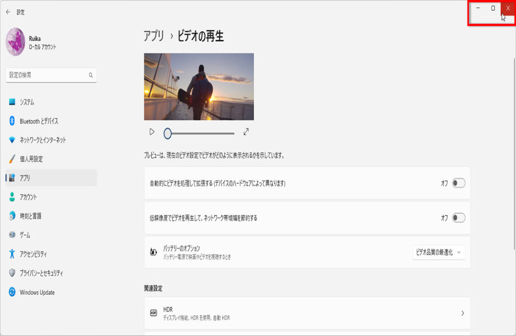 「ビデオの再生」画面の右上の「×」をクリックして閉じます、操作は以上です、