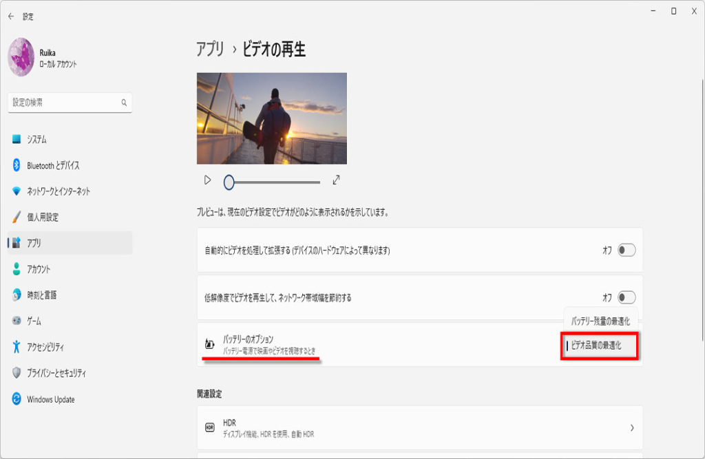「バッテリのオプション」の▽をクリック、「ビデオ品質の最適化」をクリックします。