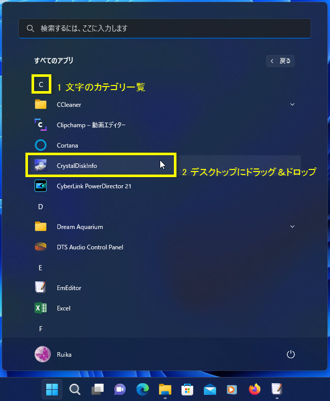 2 ショートカットを作成したいアプリ名をデスクトップにドラッグ&ドロップ