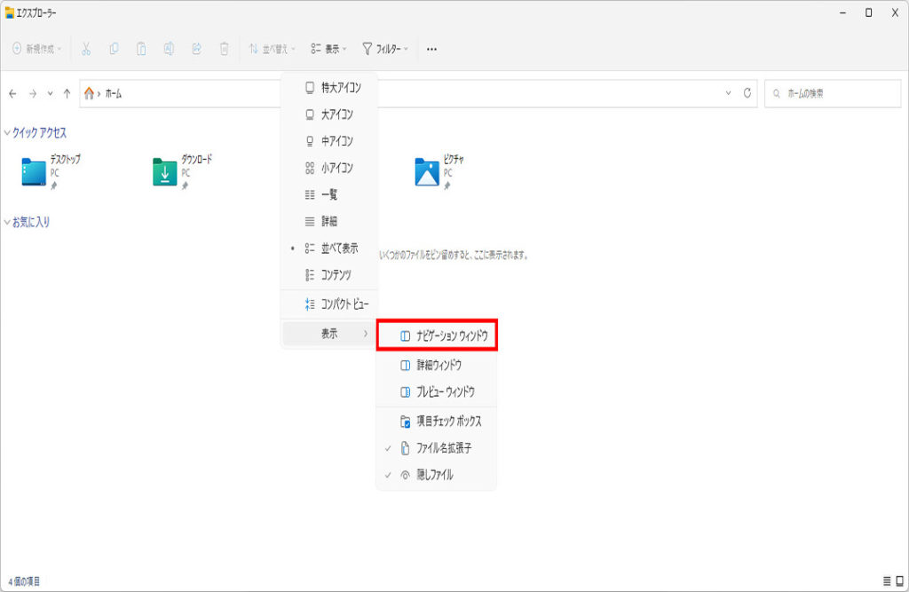 ナビゲーションウィンドウの有効または無効を確認しましょう。