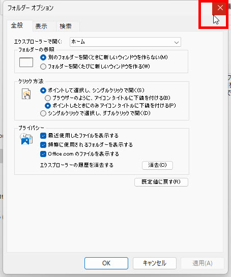 「フォルダーオプション」画面の右上の「×」をクリックして閉じます、