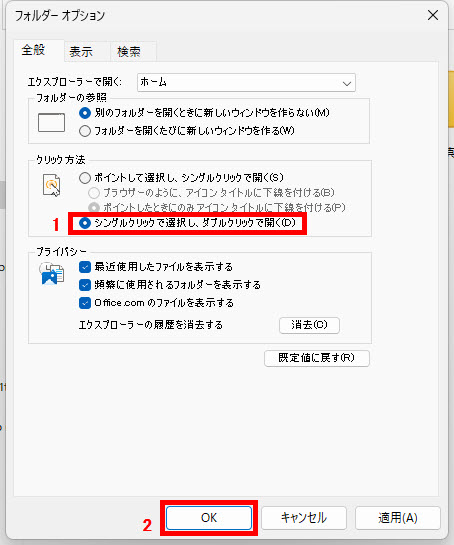 1 「シングルクリックで選択し、ダブルクリックで開く」を有効にして