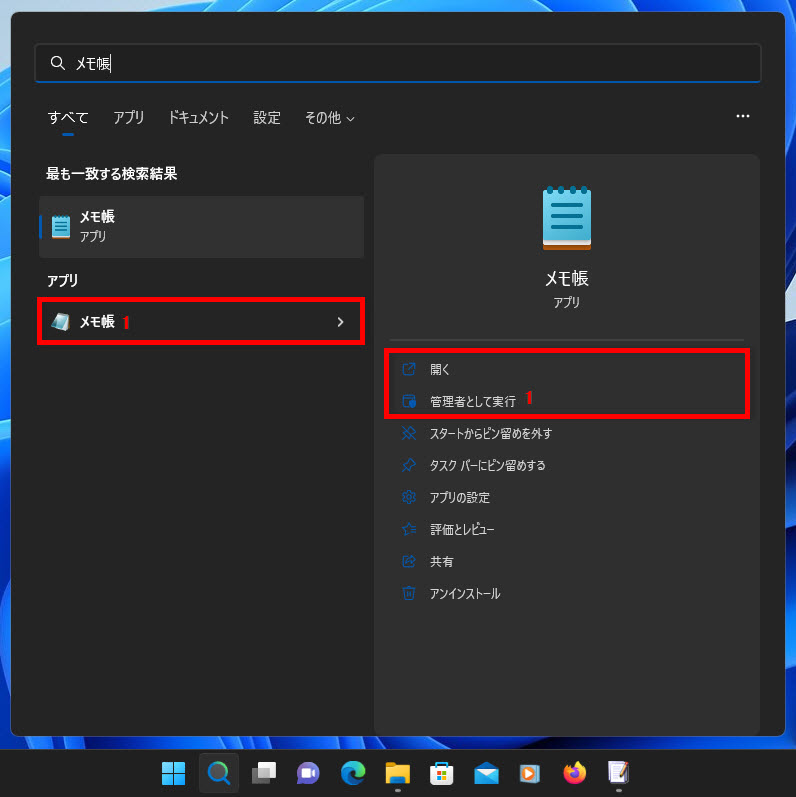 検索ボックスに探すアプリ名を入力します、例として「メモ帳」と入力します。